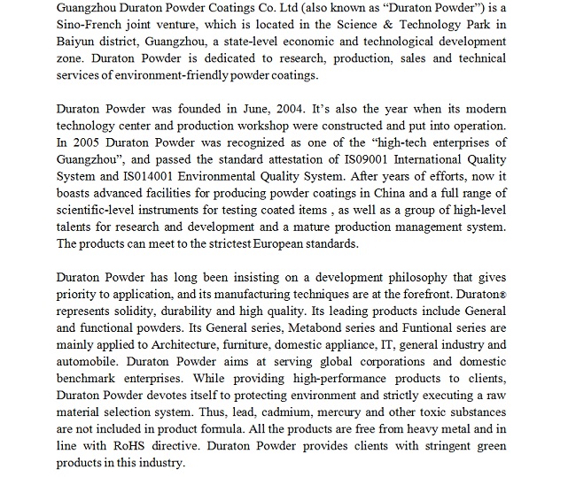 Guangzhou Duraton Powder Coatings Co. Ltd (also known as “Duraton Powder”)